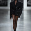 The sharply tailored black blazer commands the runway with its sculpted, angular shoulders and a plunging V‑neck that turns minimalism into power dressing. Its glossy surface catches the light, emphasizing clean lines and precision. Zippered pockets add a utilitarian edge, pushing the look fully into avant‑garde territory, merging attitude with architectural elegance.