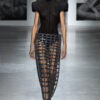 Below, the leather laser cutted skirt transforms structure into spectacle: a meticulously crafted skirt that frames the body with architectural precision. Its gridwork creates shifting negative space as the model moves, turning each step into a kinetic study of form. Together, the two pieces merge fashion, futurism, and performance into a single, arresting statement of wearable art.