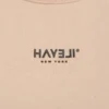A refined balance of minimalism and artistic expression. This beige oversized T-shirt features a clean front design with the signature Hayeli New York logo, while the back reveals a striking abstract line composition — transforming a wardrobe essential into a wearable work of art.