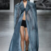 This oversized veil‑coat drifts down the runway with an ethereal, almost cinematic presence. Its sheer blue‑gray fabric catches the light in soft waves, creating a sense of movement even in stillness. The exaggerated shoulders introduce a sculptural tension, giving the piece a bold, modern outline. Across the surface, an original art print unfurls like a whispered narrative, adding depth without overwhelming the coat’s airy elegance. The result is a statement of fluid power – part veil, part armor, entirely unforgettable.