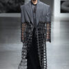 This leather‑net grey trench coat pushes the boundaries of classic outerwear, turning structure into spectacle. Its upper half begins with the familiar language of sharp tailoring – broad shoulders, clean lines, a controlled sense of authority. But as the eye travels downward, the coat dissolves into an intricate lattice of leather strips, transforming from garment to architectural framework. The gridwork reveals flashes of movement beneath, creating a dynamic interplay of shadow, skin, and negative space. This tension between solidity and openness gives the piece its power: part armor, part exoskeleton, part sculptural installation. The muted grey tone keeps the focus on form, allowing the craftsmanship and conceptual daring to speak for themselves.