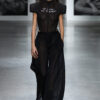 Paired with wide, fluid trousers cut from a similar weightless material, the look moves like a shadow with intent. Every step amplifies the interplay between text, form, and motion, creating a piece that blurs fashion, performance, and philosophy into a single, arresting statement.