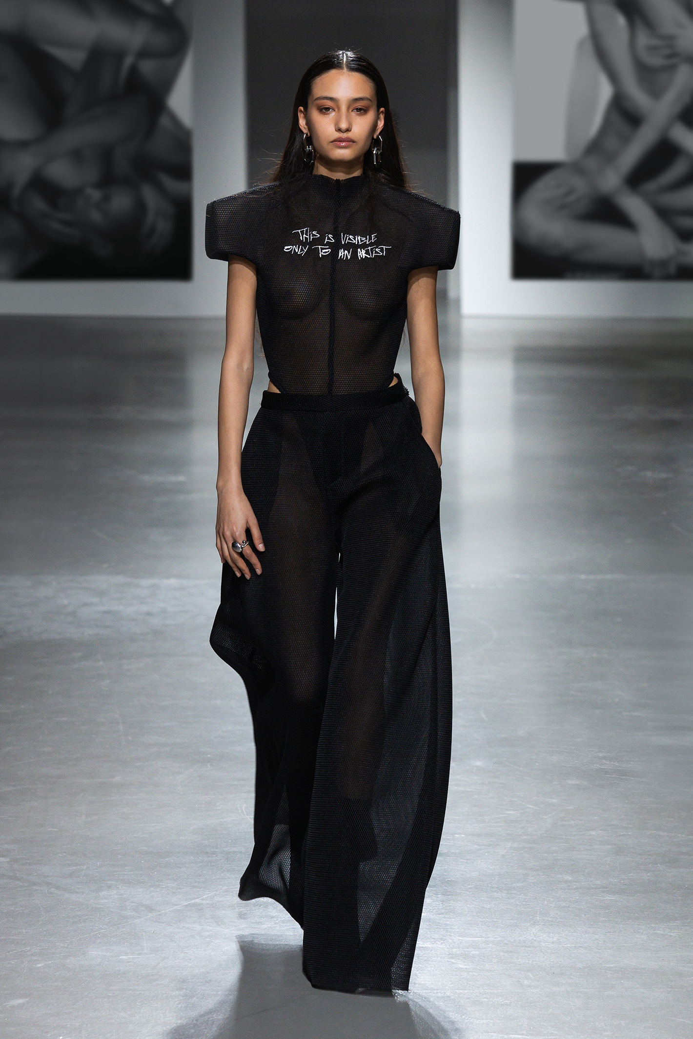 This sheer black body suit reads like a manifesto worn on skin. Its broad, structured shoulders carve out a powerful silhouette, but the true energy lies in the stark white declaration across the chest: “This is Visible Only to an Artist.” The phrase becomes both challenge and invitation, turning the garment into a conceptual lens through which the viewer must decide what they’re capable of perceiving. The transparency of the fabric adds a charged tension – revealing, concealing, and reframing the body as part of the message itself.